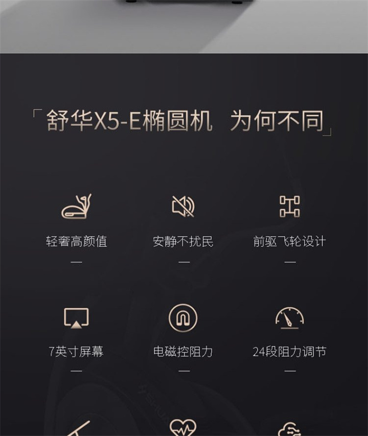 舒华家用椭圆机SH-B6500E采用电磁控系统,设有24段阻力等级,手握心律片侦测心率,7kg磁控轮。