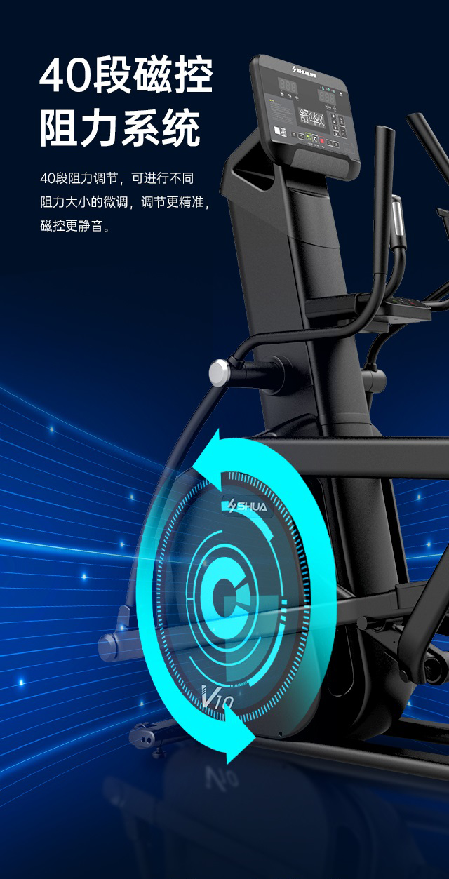 商用椭圆机SH-B9100E(LED版)采用自发电方式,磁控阻力系统的阻力系统,可以设定40段阻力段,最大使用者体重为180kg,踏步跨距可达508mm,适用于大多数人,现在锐强体育旗舰店都有这一款椭圆机,欢迎前来体验试机。