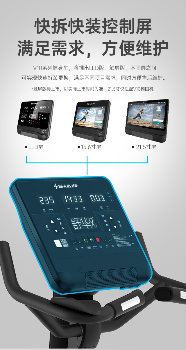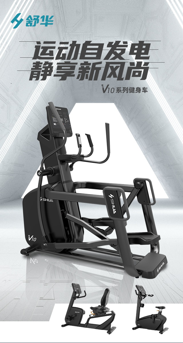 舒华立式商用健身车SH-B9100U(V10)触屏版拥有超大显示和操作屏幕, 可以任意设置阻力、时间和距离等参数,还可以即时显示心跳和转速等数据,同时,SH-B9100U提供多项科学运动处方,更轻松掌握运动节奏。